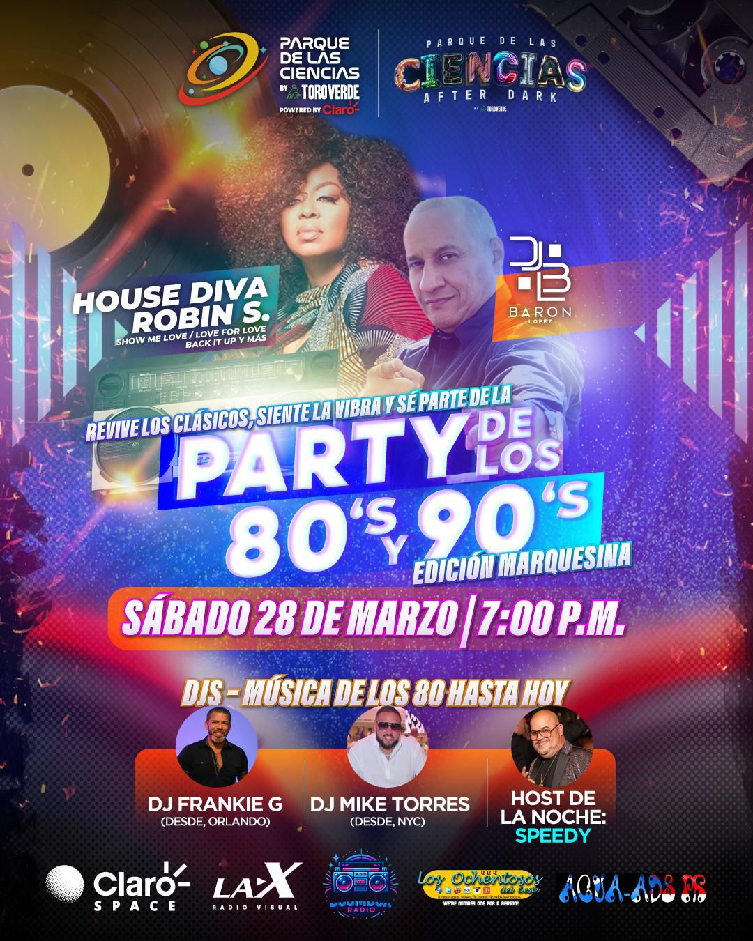 Party de Los 80's & 90's Edición Marquesina con Robin S en Puerto Rico. En el Dome del Parque de las Ciencias en Bayamón. Ademas DJ Frankie G, DJ Mike Torres y DJ Baron Lopez.